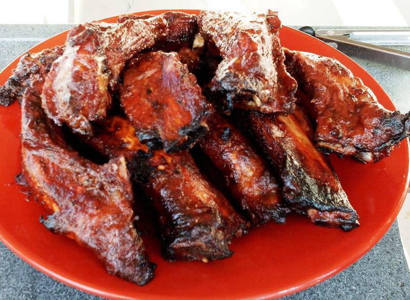 - Remove the ribs from the tinfoil and place back on the grill, same indirect heat as before. Brush one side with BBQ sauce and let it caramelize (lid closed) for 10-15 minutes. Flip the rib, brush other side with BBQ sauce, let caramelize for another 10-15 minutes. Repeat this until you get the BBQ sauce consistency you like (takes me about 4 cycles of this, 2 times on each side).